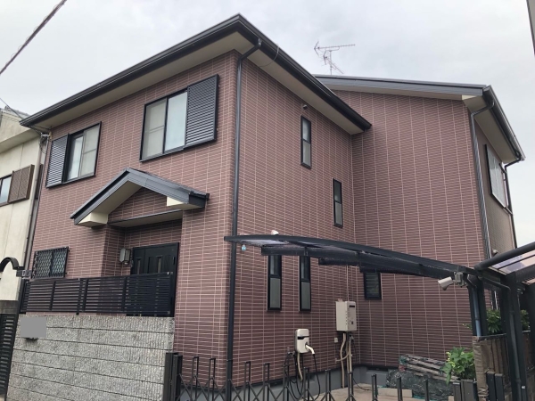 大阪府寝屋川市の成田塗装の直ぐ近所のおきゃの家の塗り替え工事工事は日本ペイントの艶なし塗料のパーフェクトトゥルーマットで完成。 屋根は定番のサーモアイSiの遮熱シリコン塗装です。