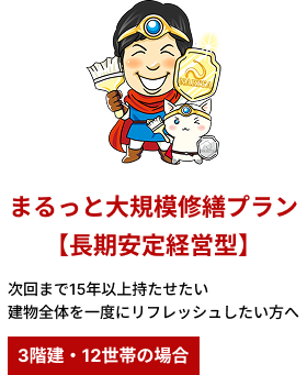 延べ床面積や劣化状況により変動しますが、一般的な3階建てアパート(12世帯程度)で、外壁・屋根・防水を含めて○○万円〜○○万円程度がボリュームゾーンです。正確な金額を算出するため、まずは無料の建物診断をおすすめしております。