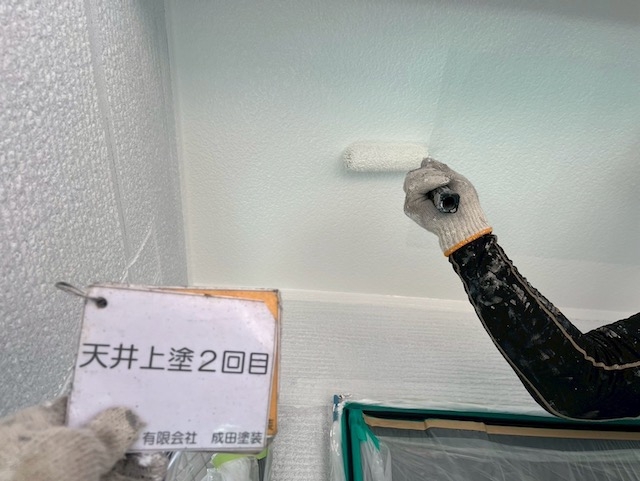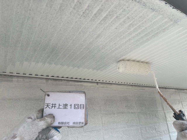 成田塗装では下を向いてる壁軒天井は専用の塗料で塗装します。