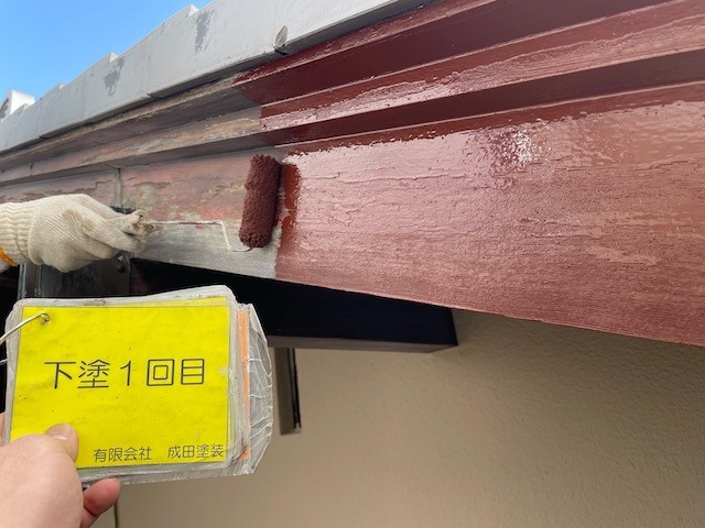 ※写真は剥がれやすく割れやすい木部の下塗り塗装 しっかりと木部専用の下塗りを塗装した後に上塗りを施工します。