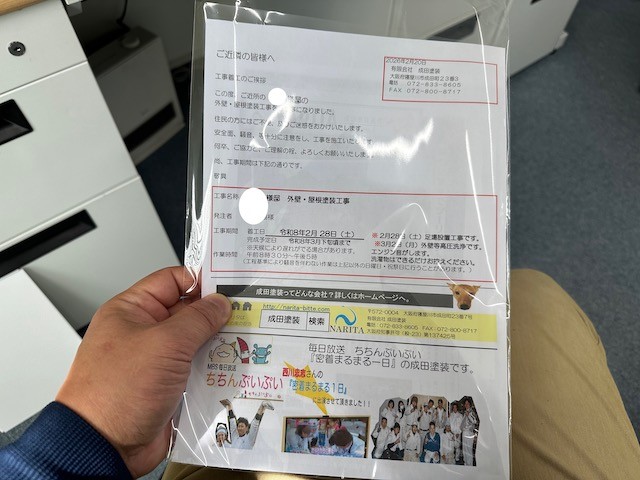 成田塗装では着工前の4日ほど前には近隣の挨拶へゆき案内状と工程などの挨拶を行います。