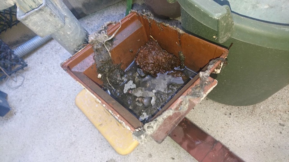 雨樋な特に長年の汚れやコケや土などが意外に溜まっている事が多いですのでコレもついでに洗い流して綺麗にします。