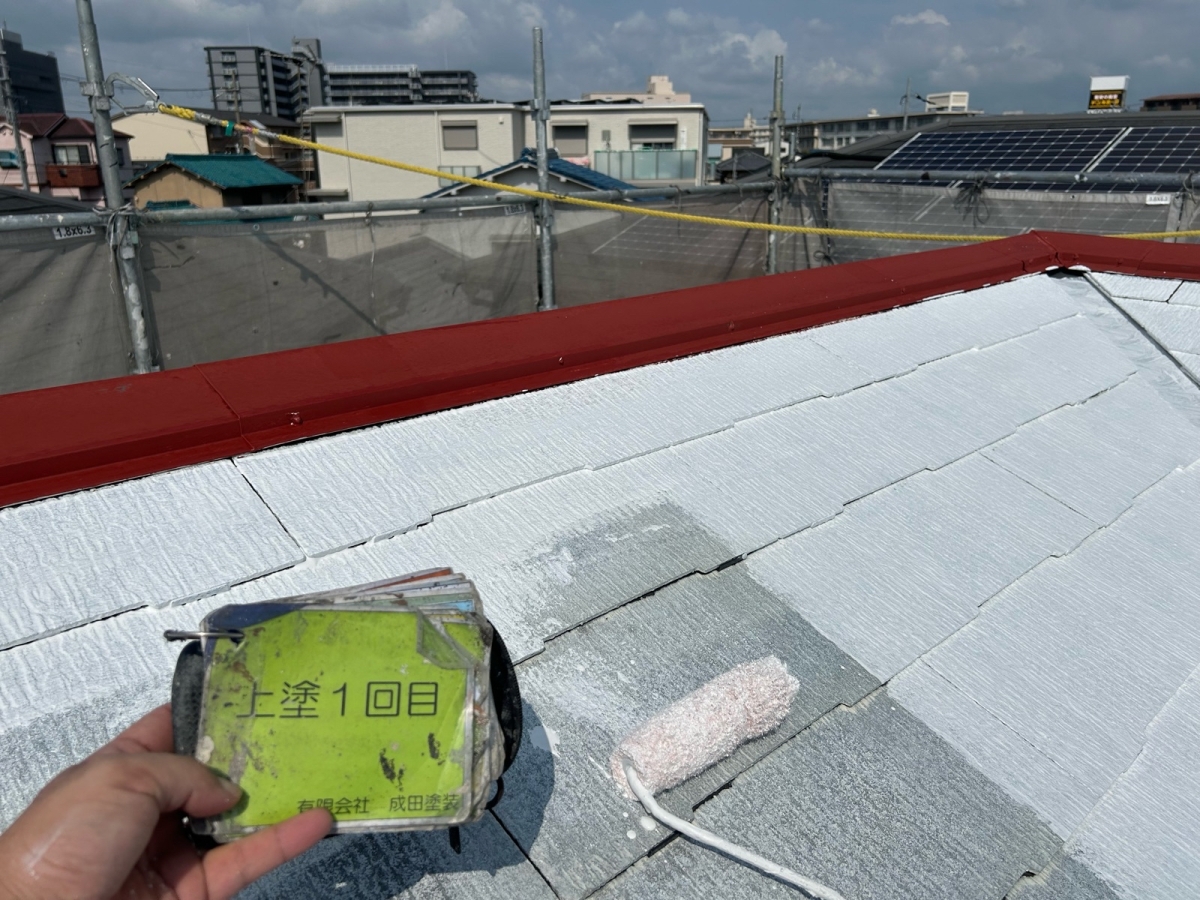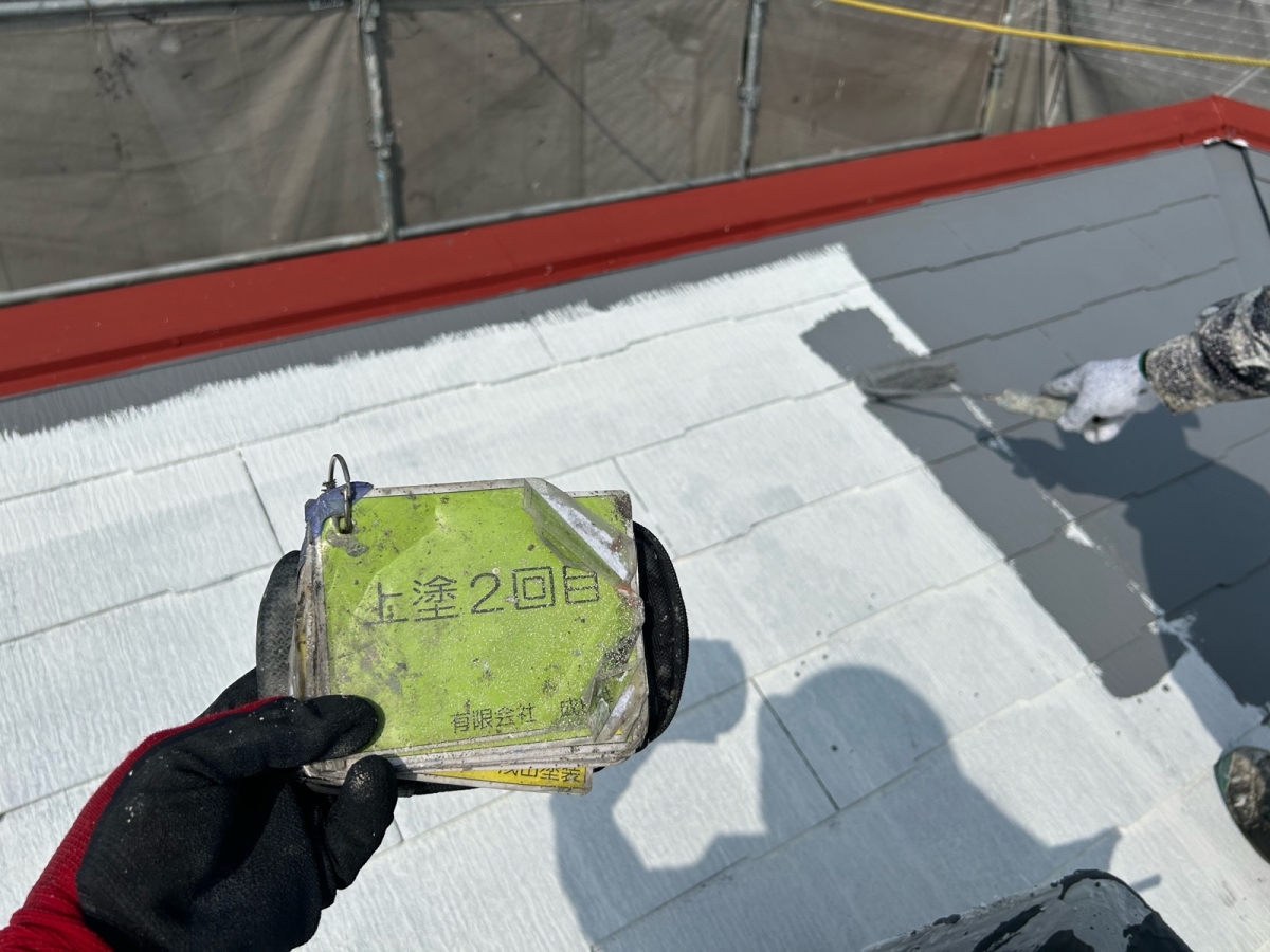 寝屋川市のN様邸 こんにちはっ!!! 成田塗装の家原です(*´ω`*) 本日は寝屋川市のN様邸の屋根塗装です♪ 下塗りはサーモテックシーラーを1回塗装して 上塗りに断熱ガイナを3回しっかり塗装しました(^_-)-☆ 断熱ガイナは断熱効果が出るようにしっかりと丁寧に塗り分けて 塗装の層を作ることが大切です(`・ω・´)ゞ 夏は屋外の熱が侵入しにくく 冬は屋内に熱が逃げにくい という効果があります( *´艸`) 2025/09/20