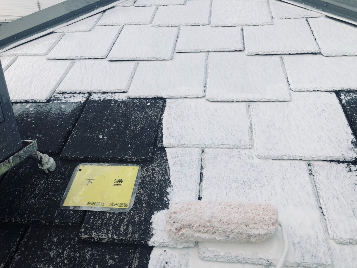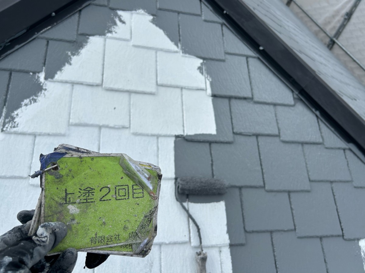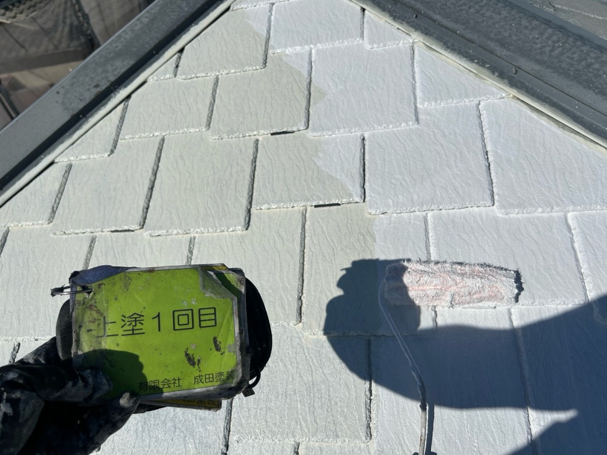 枚方市Y様邸 こんにちはっ!!! 成田塗装の家原です°˖✧◝(⁰▿⁰)◜✧˖° 本日は枚方市のY様邸の屋根塗装です♪ 下塗りはサーモテックシーラーを1回塗装してから 上塗りに断熱ガイナを3回塗装しました(^_-)-☆ 断熱ガイナは断熱効果が出るように しっかり丁寧に塗り分けて塗装の層を作ることが大切です(*^▽^*) ガイナの塗膜が屋根や壁に生じる熱の移動を抑制するので 冬は屋内に熱が逃げにくく 夏は屋外に熱が侵入しにくいという効果が期待できます(`・ω・´)ゞ 2025/11/07