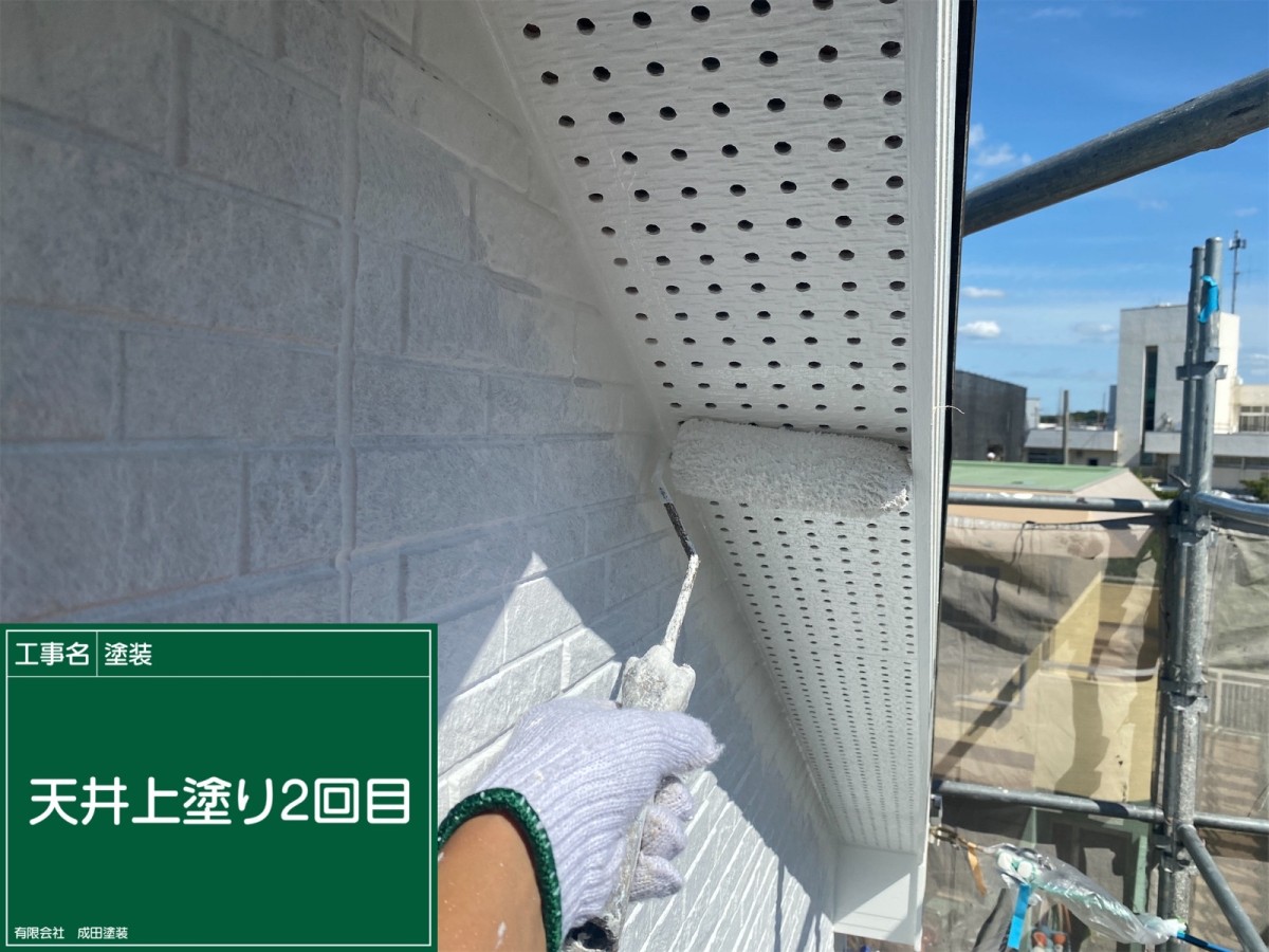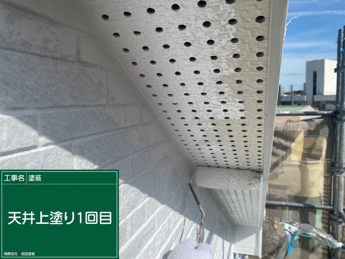 四条畷市M様邸 こんにちはっ!!! 成田塗装の家原です°˖✧◝(⁰▿⁰)◜✧˖° 本日は四条畷市のM様邸の軒天井上塗りです♪ 軒天上とはどの住宅にもあるのですが お家を見上げた際に外壁から外側に突き出している屋根部分の裏を指します(^_-)-☆ 雨水が流れていく屋根の端を軒先と呼ぶため その裏の天井を指します\(^o^)/ 軒天上の色は外壁とは違う色で明るめに塗ることで 家全体の雰囲気を変えてメリハリを付けることができます(^^)/ 2025/12/01
