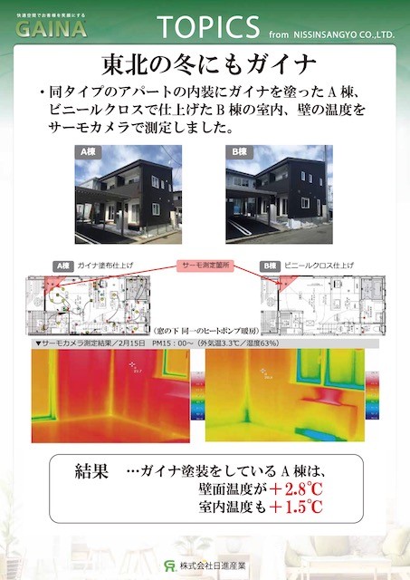 今回は、寒さ対策に関するガイナの情報を配信!! ガイナは冬季の寒さ対策にも大きな効果を発揮します。 今回の情報では、実際にガイナをご採用いただいたアパートでの事例を、 データや写真を交えてご紹介しております。 東北の厳しい冬でも、ガイナが体感温度向上の一助となることを 実測データをもとにご紹介しておりますので、 ぜひご一読いただけますと幸いです。 お知らせ 2025/12/12