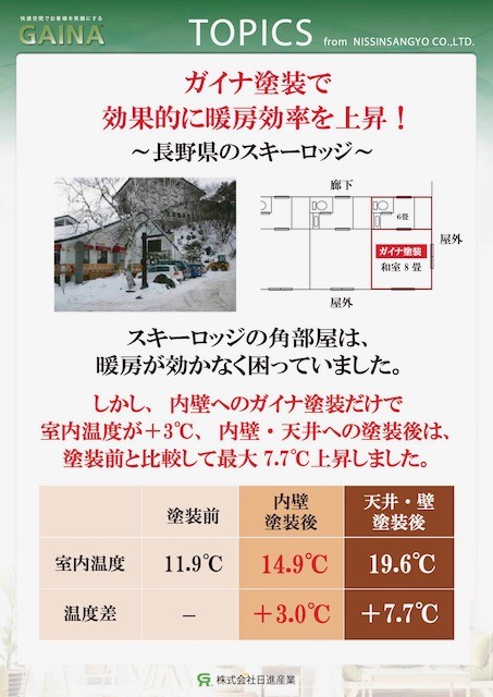3℃の温度低下を防いでおり、暖房効果が内壁のガイナ塗装だけで変化しました。