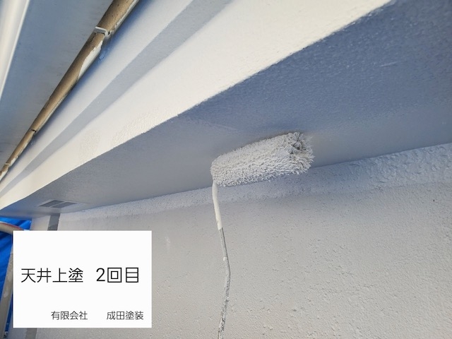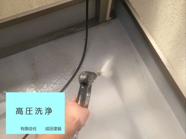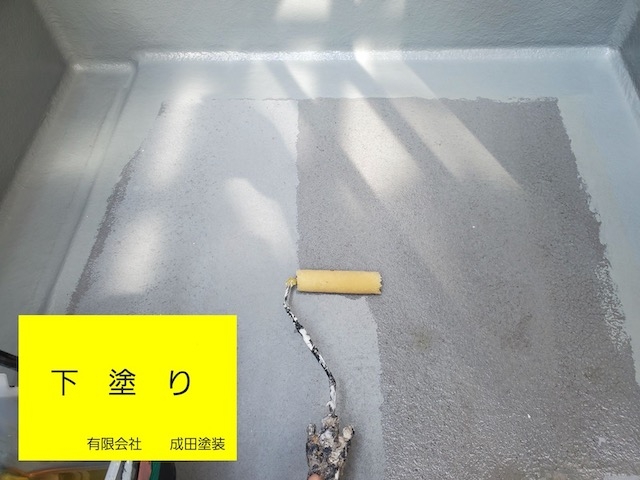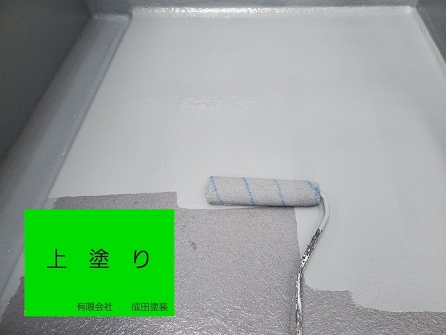 ベランダの床のトップコートは東日本塗料の遮熱トップコートで光安定剤入った塗料ですので色褪せもしづらく長持ちします。