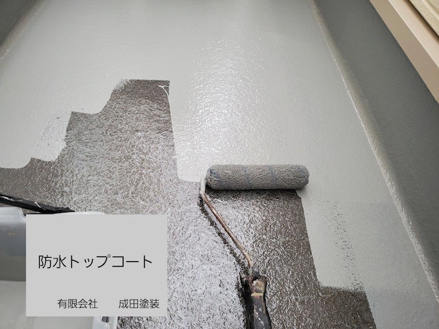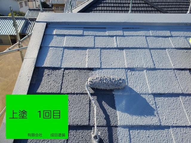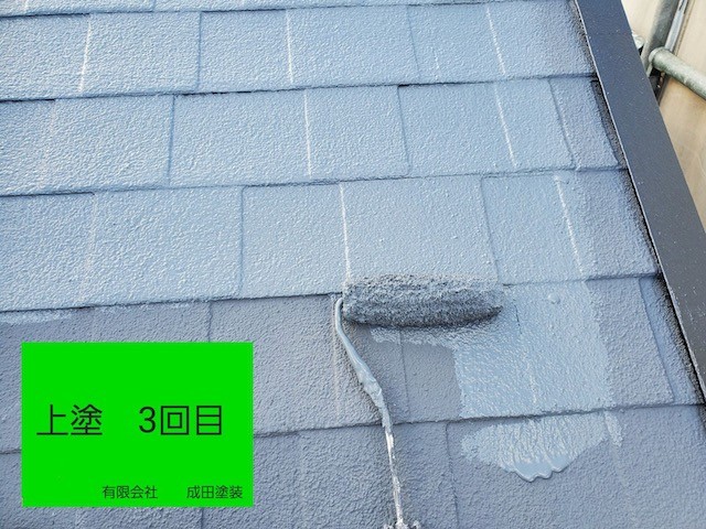 屋根はアスファルトシングルという屋根の種類ですので、専用の水性のサフェーサーを塗装した後に断熱ガイナを3回塗りです。