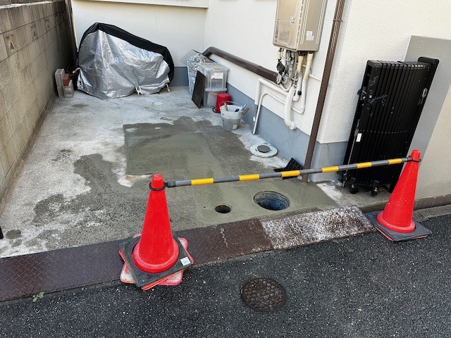 車庫はどうしても車重がかかるので下へ沈下してくることもありますが、特に今回は浄化槽の修理跡の事もあり土が下がってしまったのだと思います。