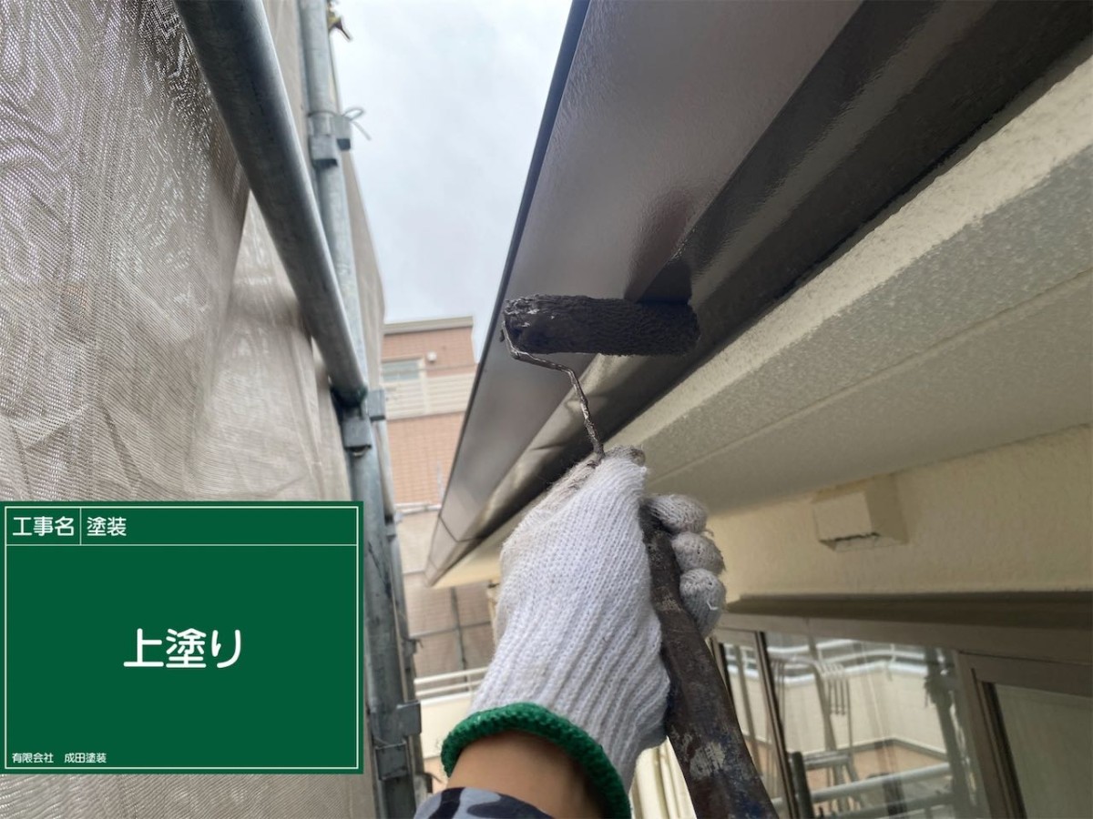 付帯部の雨樋はフッソ塗料で下地を含めて2回塗りで仕上げました。