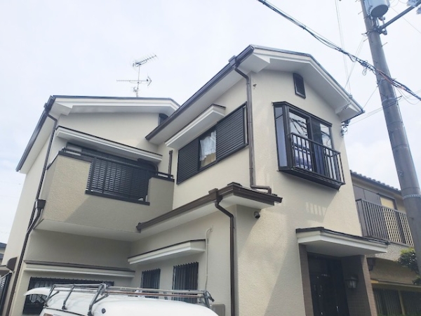 寝屋川市の寿町で外壁塗装。屋根も壁も分厚く施工してひび割れに強い外壁を断熱ガイナで仕上げました。 寝屋川市 2025/09/21 タグ:屋根 , 外壁 , 断熱塗装 , 断熱ガイナ , 無機塗装 , ホワイト系 , グレー系 , 防水工事